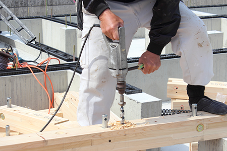 型枠加工は、作成した加工図をもとに必要な型枠を作る作業です。型枠は専用の合板に桟木(さんぎ)と呼ばれる角材を釘打ちして作ります。