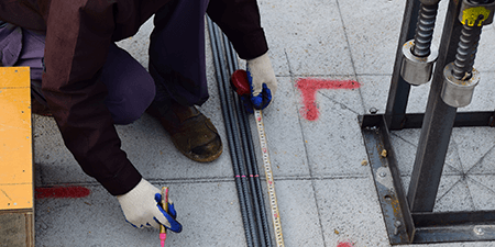 墨出しは、型枠を立てるべきところに線や印をつけていく作業のこと。ここからは現場での作業です。まず、精密な測量機器でコンクリートの床の上に基準線を引き、型枠を建てるべきところに線や印をつけていきます。